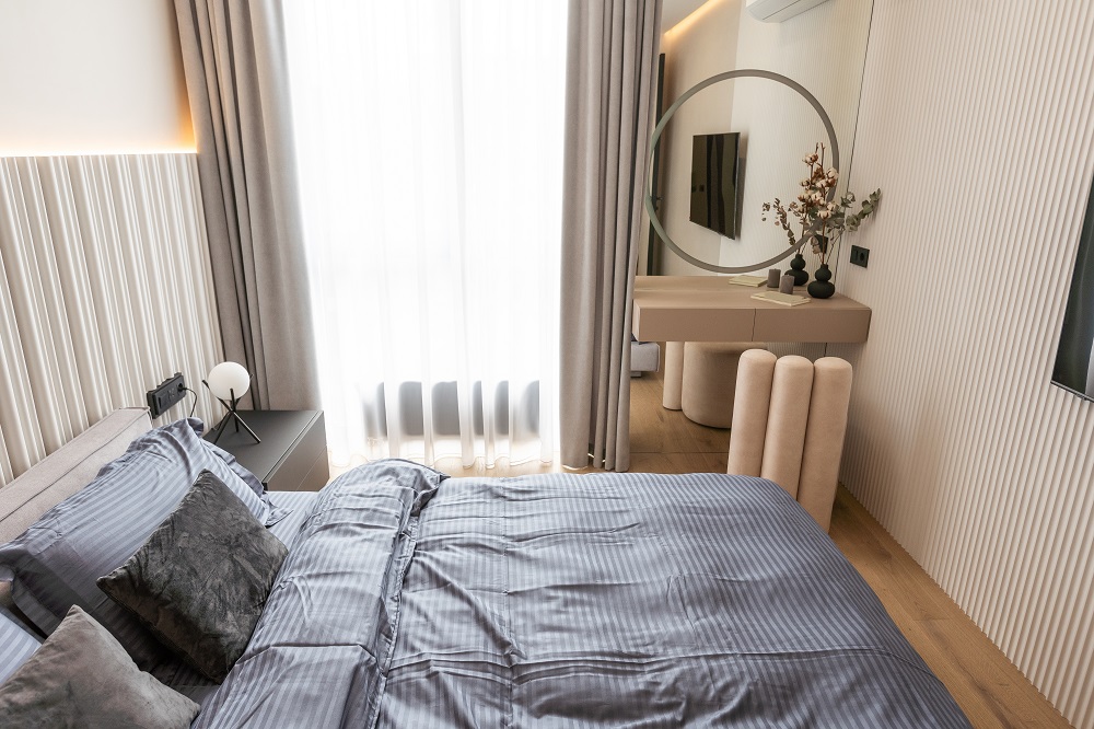 Küçük yatak odalarında soft bej, pastel mavi, açık gri gibi açık ve nötr tonlar tercih edilebilir. Bu renkler, ışığı yansıtarak odanın hacmini artırır ve sakin, huzurlu bir atmosfer yaratır.